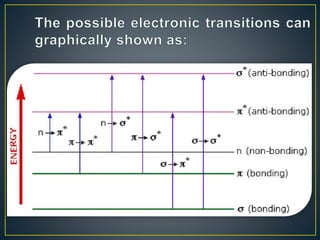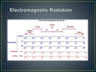 This document provides an overview of spectroscopy. It discusses topics like electromagnetic radiation, photons, wavelength, frequency, the electromagnetic spectrum, absorption spectroscopy, emission spectroscopy, Lambert's law, Beer's law, chromophores, auxochromes, shifts in absorption spectra, and components of a visible spectrophotometer like sources, filters, and monochromators.
