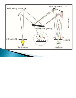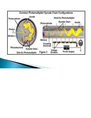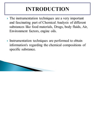 The document discusses various instrumentation techniques essential for analyzing chemical compositions in diverse materials such as food, drugs, and environmental samples. It covers a range of analytical methods, including spectroscopic, electrochemical, and chromatographic techniques, along with details on light sources, wavelength selectors, and detectors used in spectroscopy. Key components such as photomultiplier tubes and phototubes are explained, highlighting their applications in chemical and medical analysis.