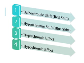 This document provides information about spectroscopy. It defines spectroscopy as the study of interaction of electromagnetic radiation with matter. It discusses the basic principles of UV-visible spectroscopy and infrared spectroscopy. UV-visible spectroscopy involves absorption of radiation in the visible and UV region, causing electrons to move between energy levels. Infrared spectroscopy analyzes absorption in the infrared region to determine molecular structure based on vibrational and rotational transitions. The document also defines key terms used in spectroscopy like chromophore, auxochrome, and discusses different types of shifts that can occur in absorption spectra.