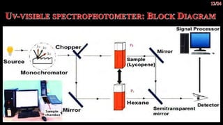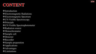 The document discusses UV-visible spectroscopy, a technique that uses electromagnetic radiation to analyze the atomic and molecular structure of matter by measuring light absorption at specific wavelengths. It explains the components of a UV-visible spectrophotometer, the principles of Beer’s and Lambert’s laws, and highlights the applications, advantages, and limitations of this method across various scientific fields. UV-visible spectroscopy is notable for its ability to analyze small sample sizes and its widespread use in industries such as pharmaceuticals, forensics, and biochemistry.