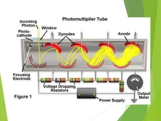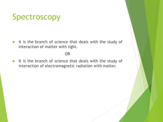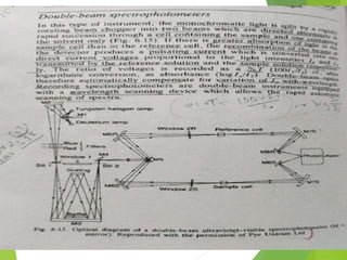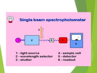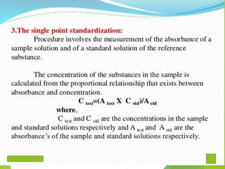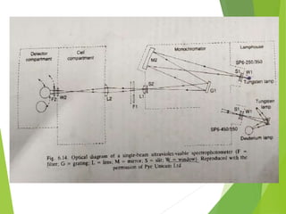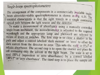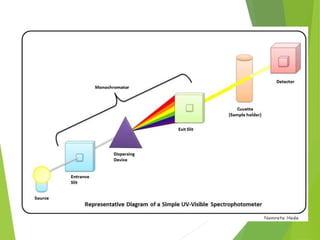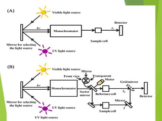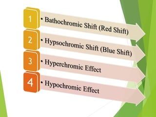The document provides an extensive overview of UV/Visible spectroscopy, including principles, types of spectroscopy, electronic transitions, and the Beer-Lambert law. It discusses the concepts of absorbance shifts, instrumentation components, and methods for quantitative analysis of single and multi-component dosage forms. Key terms like chromophore and auxochrome, along with detailed methodologies for spectrophotometric analysis, are also covered.