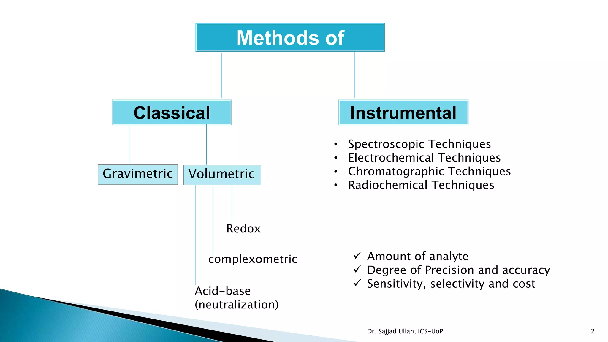 The document provides an overview of various instrumental methods of analysis, focusing on spectroscopic techniques, particularly UV-visible spectroscopy. It details the principles of electromagnetic radiation (EMR), the relationship between wavelength and energy, different types of spectroscopic instruments, and the importance of components such as light sources, wavelength selectors, and detectors. Additionally, it discusses selection rules for electronic transitions and the basics of quantitative analysis in absorption spectroscopy.