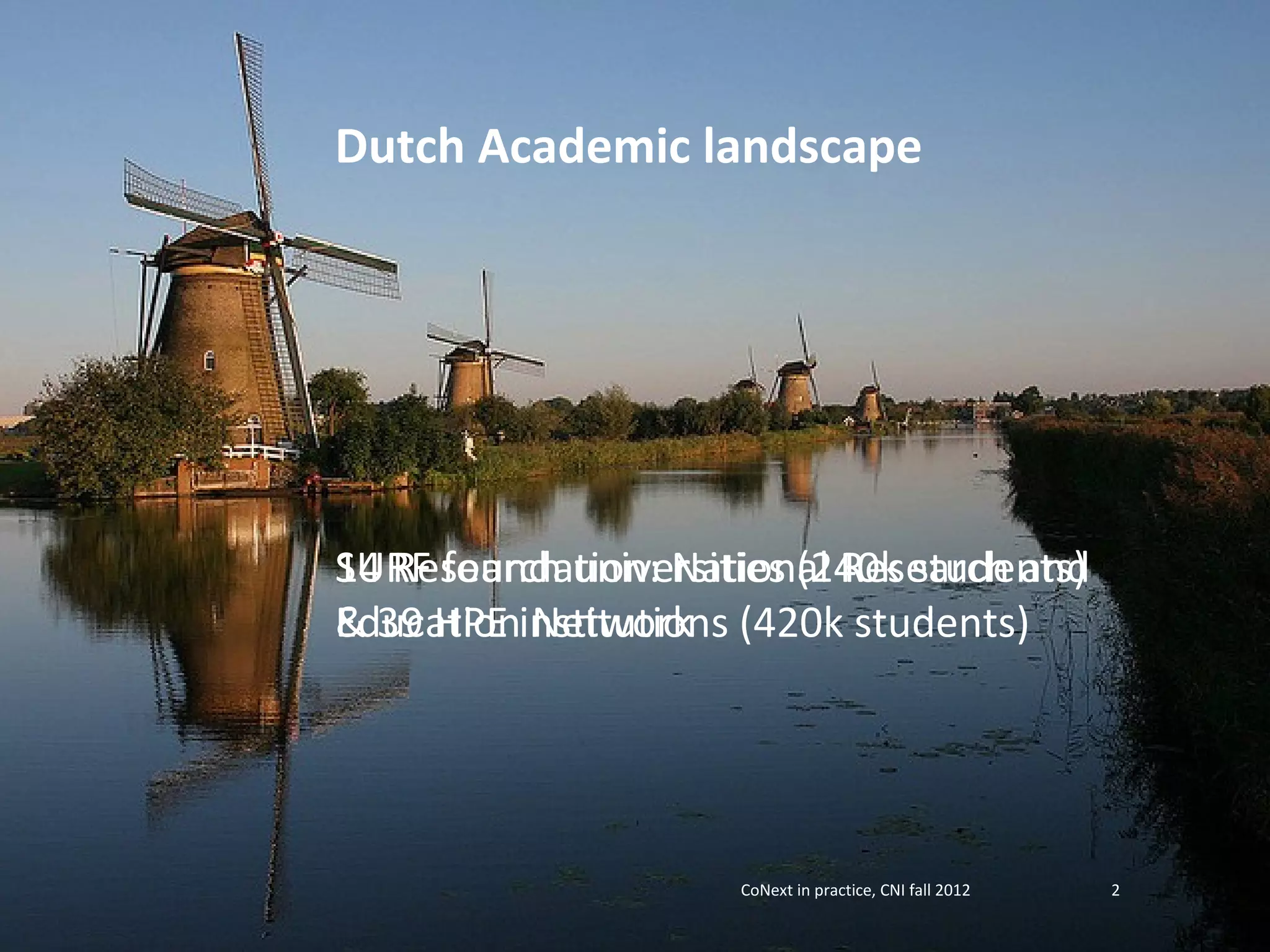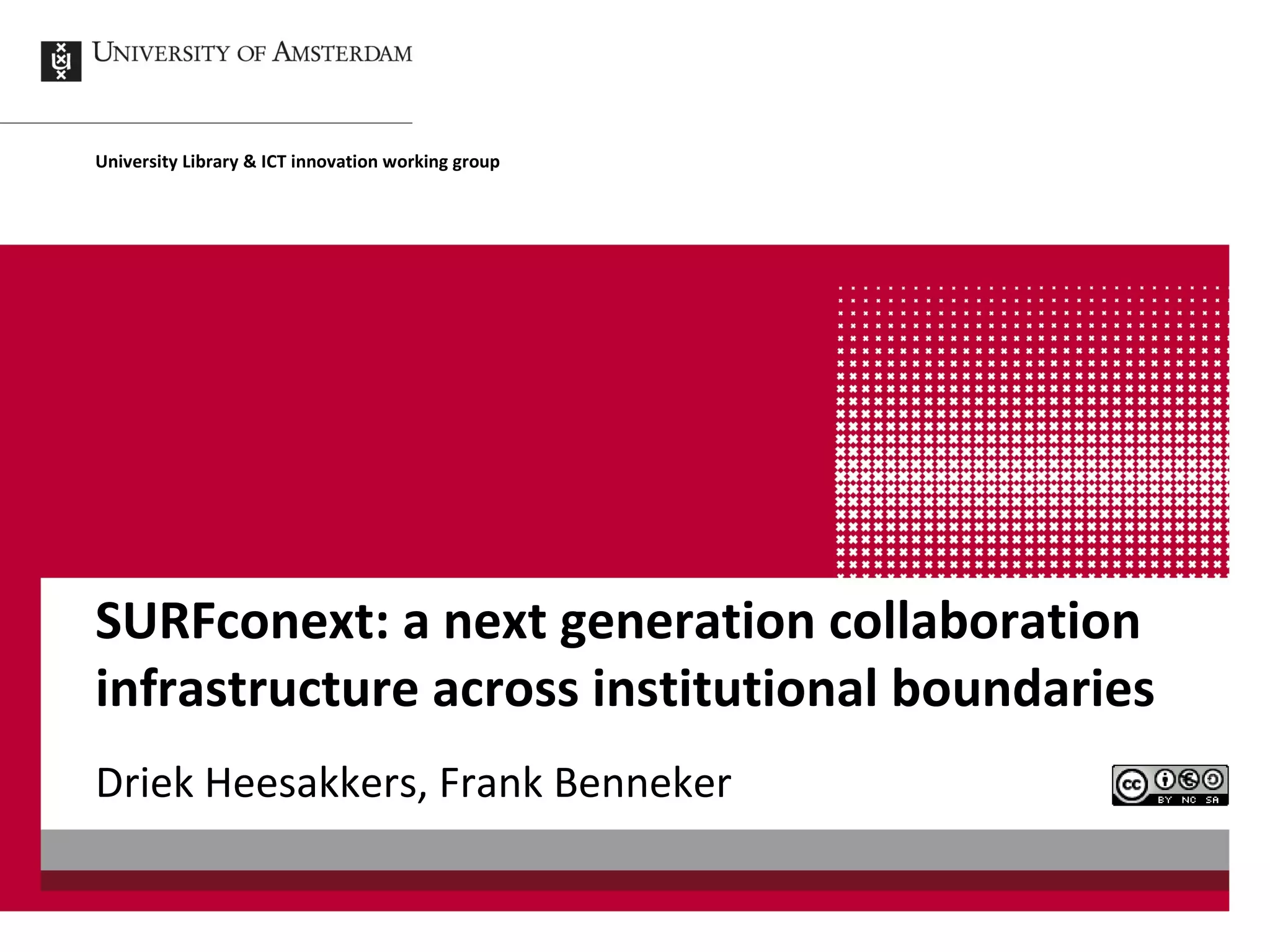 This document discusses SURFconext, a next generation collaboration infrastructure across Dutch academic institutions developed by SURF foundation. It provides an overview of the Dutch academic landscape including 14 research universities and 39 higher professional education institutions. It then discusses SURFconext from the perspectives of libraries and virtual research environments. It provides examples of SURFconext implementation at the University of Amsterdam and scenarios for collaboration across institutions. It discusses lessons learned and positions SURFconext as a cloud service broker to enable access to commercial and research services.
