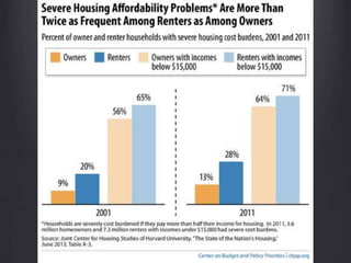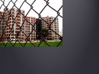 The document discusses the history of public housing in Chicago, focusing on the Cabrini-Green housing project. It provides background on the 'Little Hell' neighborhood that preceded Cabrini-Green and details the original Cabrini Homes built in 1942. Over time, Cabrini-Green deteriorated and crime increased, leading to its demolition and redevelopment into mixed-income housing starting in the 1990s. However, fewer affordable units were built than were demolished, displacing many low-income residents."