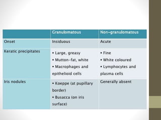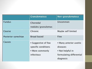 This document provides an overview of uveitis, including its definitions, classifications (anterior, intermediate, and posterior uveitis), clinical presentations, and associated systemic diseases. It discusses diagnostic investigations, treatments—primarily corticosteroids and immunosuppressants—and emphasizes the importance of addressing complications such as cystoid macular edema. Additionally, the document highlights the role of various therapies and management strategies to relieve pain and prevent visual loss.