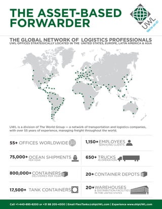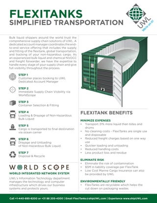 Flexitanks provide benefits for transporting bulk liquids including transporting 31% more liquid than drums and totes, eliminating cleaning costs as they are single-use, and reducing freight and handling costs. They also eliminate the risk of contamination and include $5M in liability coverage. Flexitanks are recyclable which helps reduce packaging waste. UWL provides a full supply chain solution for transporting non-hazardous bulk liquids using flexitanks, including fitting, transportation by ocean carrier, tracking, and disposal.