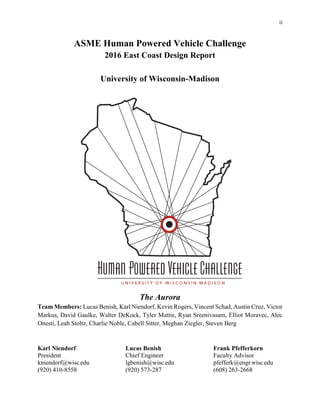 The document summarizes the design of the University of Wisconsin-Madison's human powered vehicle "The Aurora" for the 2016 competition. Key points: