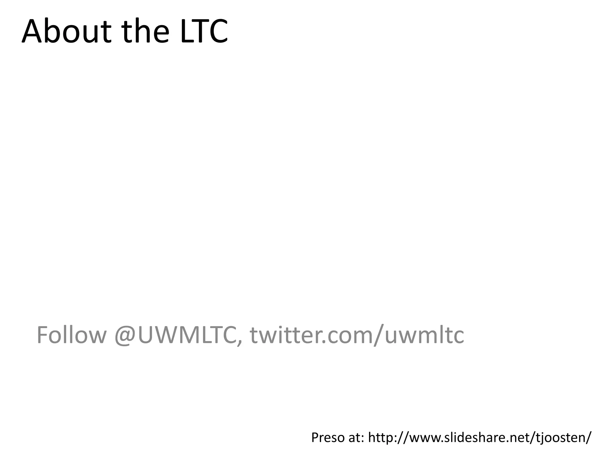 The UW-Milwaukee Learning Technology Center (LTC) provides faculty development programs and pedagogical consultation to guide instructors in various course delivery modes including tech-enhanced, blended, online and traditional. The LTC helps with content creation, implementing interactivity, and designing assessments for different modes. The faculty development program uses a blended format and aims to help instructors start redesigning courses, develop teaching skills, and experience blended learning as students. The program outcomes include developing course redesign plans and materials.