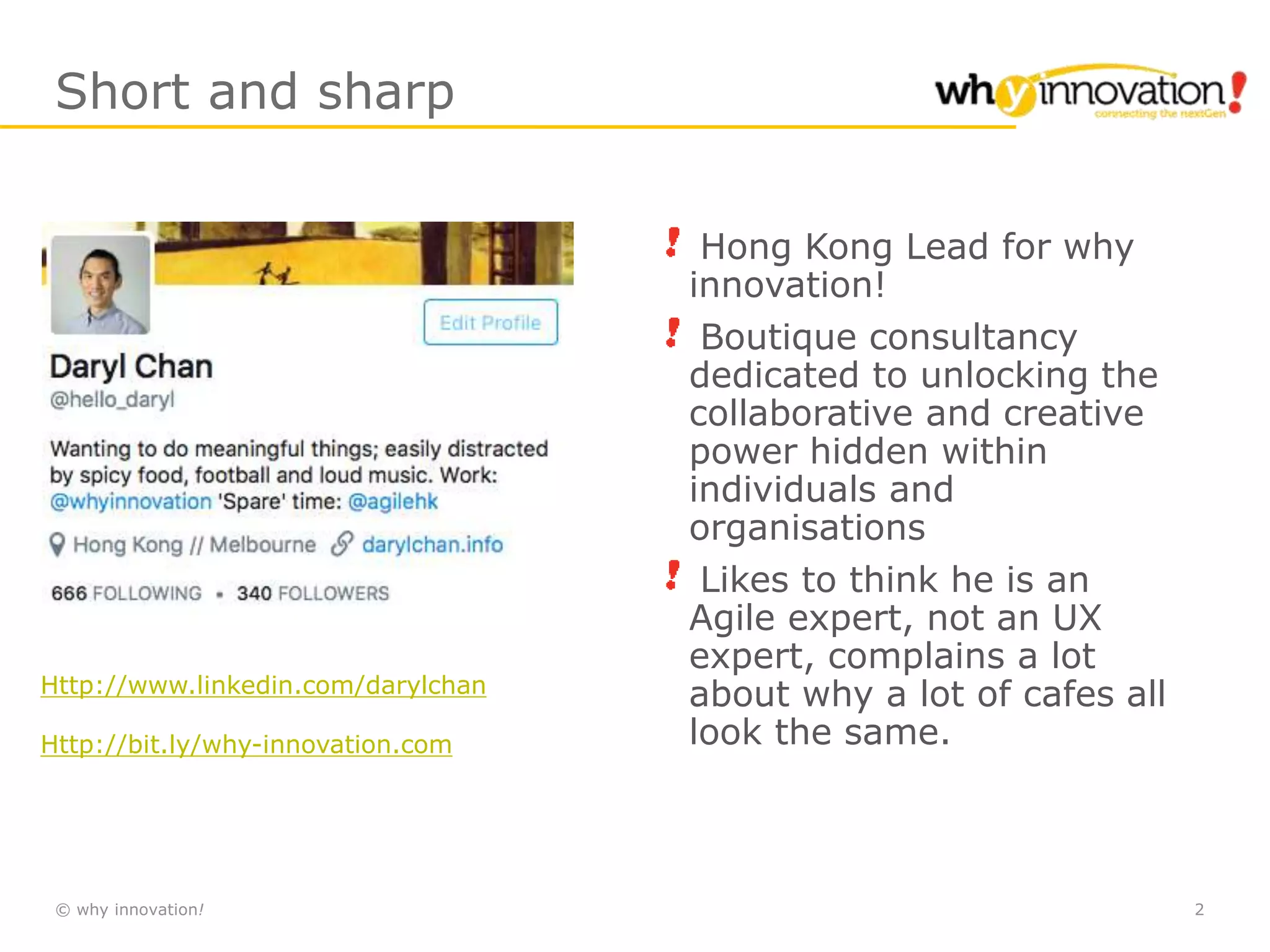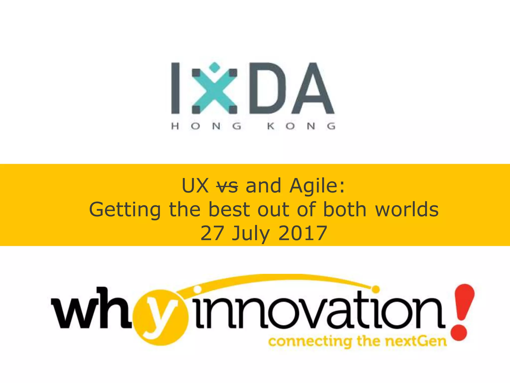 UX vs and Agile: Getting the best out of both worlds is a document that discusses combining UX and Agile approaches. It describes a design sprint case study where a team conducted user interviews, generated and iterated on ideas, created prototypes, and validated prototypes with users. The document also outlines different approaches for integrating UX and Agile processes, such as having UX occur before development, within sprints, or using hybrid models. It emphasizes the importance of collaboration, gaining user feedback, and balancing short and long-term goals.
