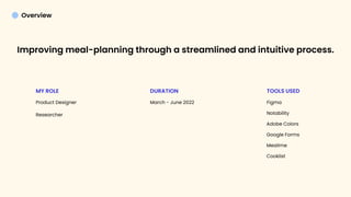 This case study presents the conceptual design of Yumpal, a meal planning application. The designer conducted research on existing apps, including competitive analyses and user reviews. Key pain points identified included a lack of recipe variety, inefficient filtering, and inability to edit shopping lists. To address these, the designer surveyed users and prioritized features like calendar planning, community recipes, advanced filtering, and editable shopping lists. Low-fidelity wireframes and high-fidelity mockups were created depicting the user experience. Usability testing yielded generally positive feedback, though more prototypes and testing were identified as areas for improvement.