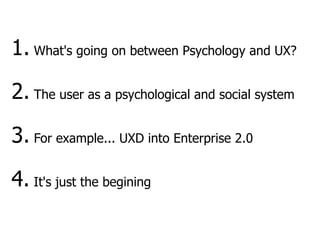 The document discusses the relationship between psychology and user experience design (UXD). It notes that psychology now informs UXD through areas like persuasive design, social interfaces, and changing user behaviors. The user is viewed as both a psychological and social system, as digital interactions extend cognitive processes and social dynamics. For enterprise contexts, UXD can focus on enabling sociality to encourage collaboration and knowledge sharing. The document argues that UXD needs to more deeply integrate perspectives from fields like social psychology to design richer psychological and social experiences for complex users.