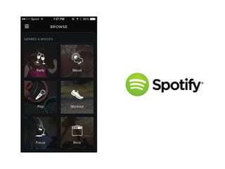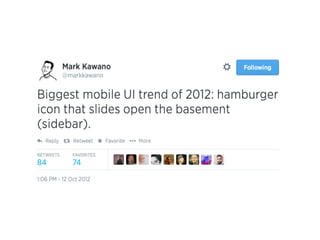 The document provides tips for organizing content and designing user interfaces for mobile devices. It discusses trends in mobile apps like emotional connections, self-improvement apps, and dashboards. It also offers guidance on navigation, prioritizing information, calls to action, notifications, and profiles. The goal is to create intuitive, engaging experiences that solve users' problems and guide them through the app efficiently.