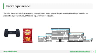 This document discusses user experience design. It defines user experience as how a person feels when interacting with or using a product, whether physical or digital. For a good user experience, a product needs to be usable, equitable, enjoyable, and useful. It then discusses each of these criteria in more detail. The document also outlines several jobs in the field of user experience design, including interaction designers, visual designers, motion designers, UX researchers, UX writers, UX program managers, and UX engineers. It provides brief descriptions of the roles and responsibilities of each type of job.