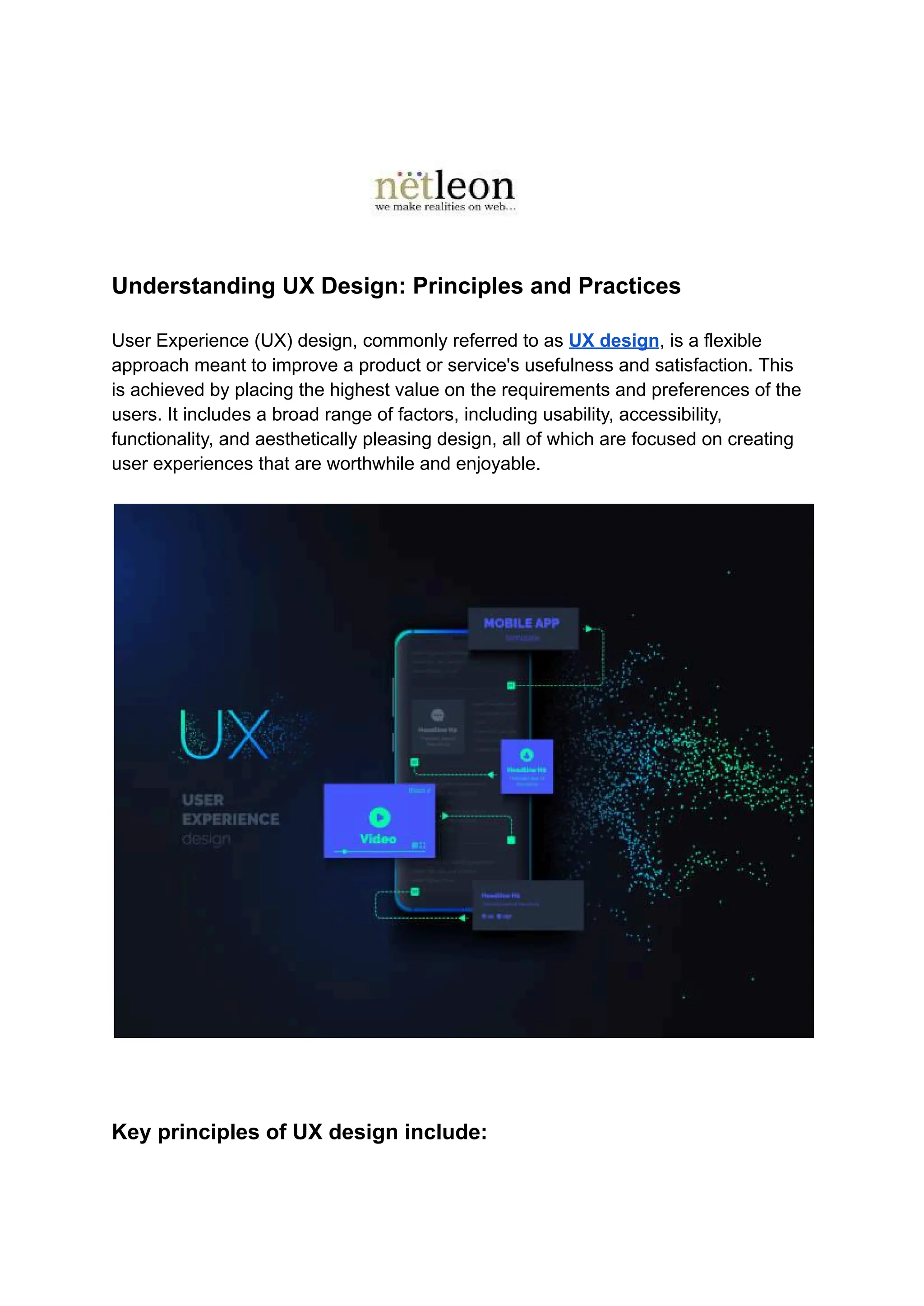 UX design aims to improve products and services by focusing on user needs and preferences to create experiences that are useful, satisfying and enjoyable. Key principles of UX design include user-centered design, usability, accessibility, consistency, clarity, feedback, flexibility, iteration and simplicity. UX design seeks to place highest priority on user requirements through an approach that considers factors like functionality, aesthetics and design.