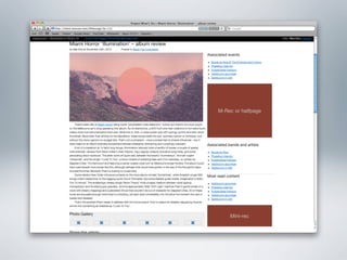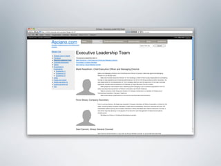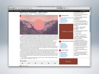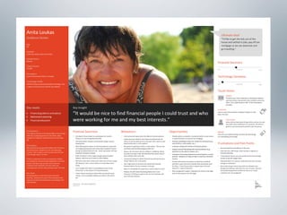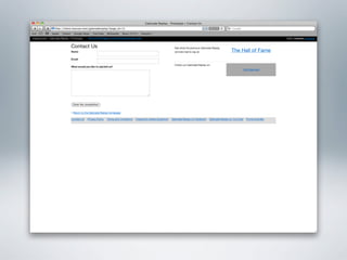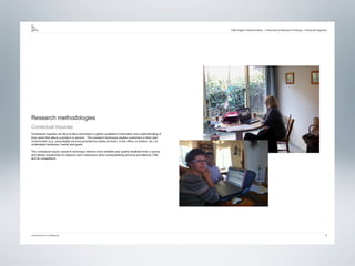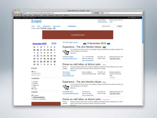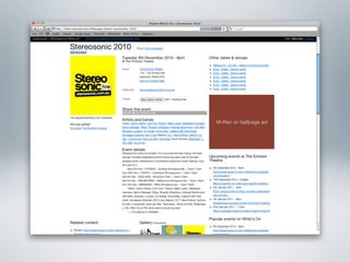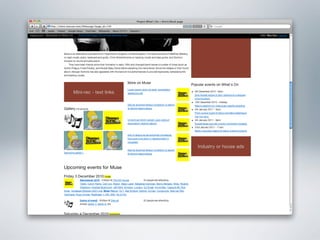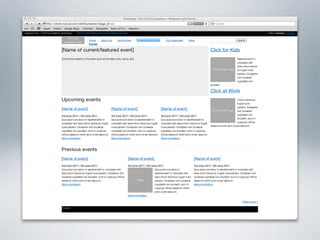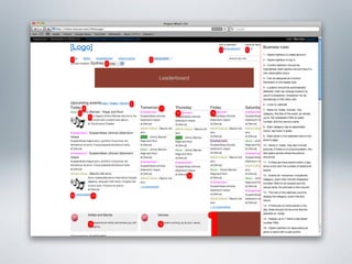 The document provides examples of wireframes and prototypes created for various clients including "What's On" for gig guides, Asciano focusing on share price and plans, and Click Foundation focusing on donations and volunteer work. It also includes process flows for allowing people to vote on tips, an Optus MyBiz shopping interaction, and an analysis of a homepage usability with notes.