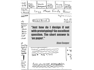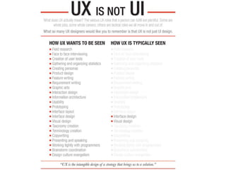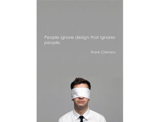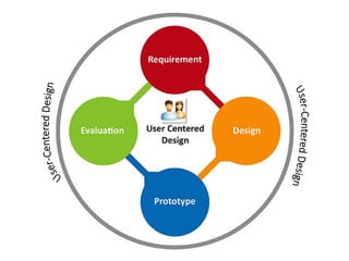 The document discusses the importance of user experience (UX) design, emphasizing the necessity of understanding users' needs, abilities, and limitations throughout the design process. It highlights various design principles including usability, minimalist design, and the relationship between physical objects and their functions. The document also covers methodologies such as user personas, prototyping, and heuristic evaluations to enhance software usability.
