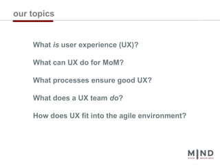 The document provides an overview of user experience (UX), emphasizing its importance in meeting both user and organizational goals through various design processes and elements. It outlines the roles and tasks of a UX team, the significance of strategy, and how UX integrates within an agile framework to create high-quality products. The text highlights the necessity for a well-defined UX strategy that aligns business objectives with user needs to ensure successful product adoption.