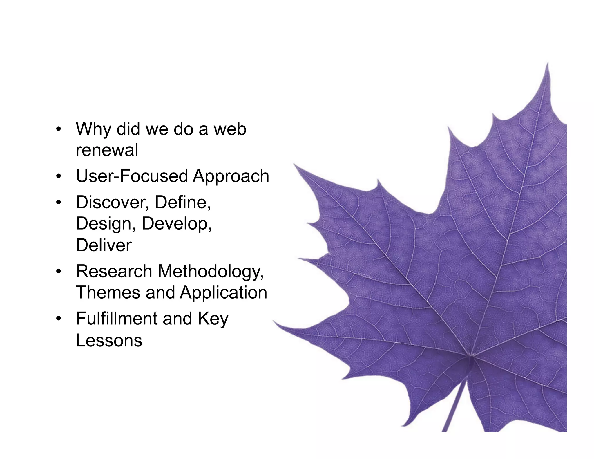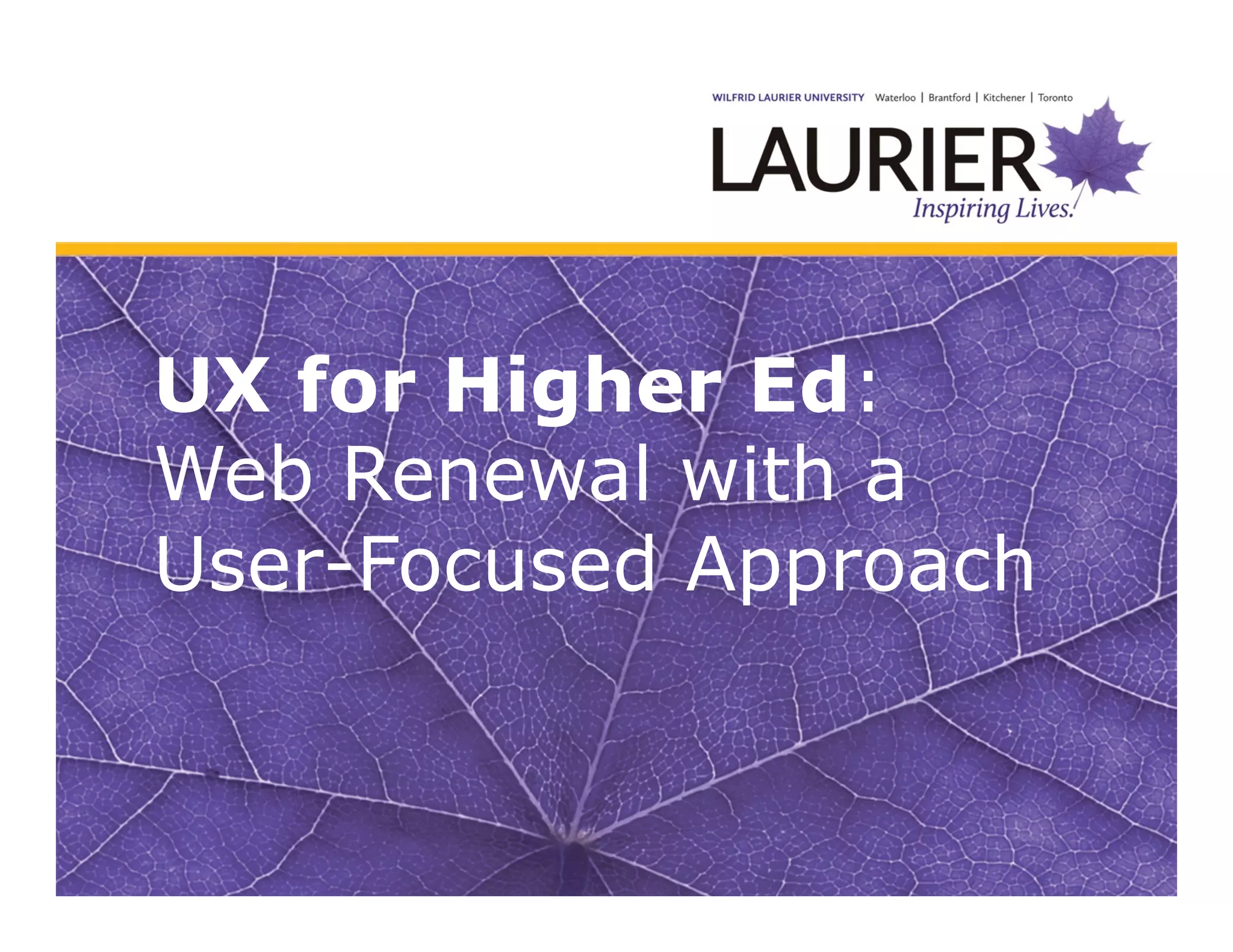 Wilfrid Laurier University conducted a user experience (UX) focused web renewal to transform their digital experience and internal processes. Through research including interviews, surveys, focus groups and analytics, they identified themes around integration of systems, personalization, academic content and communication. This informed the design of the new website architecture and prototypes, which were tested. The renewed website launched with increased traffic, enrollment and positive feedback compared to the legacy site. Key lessons included prioritizing joint leadership, communication and establishing a permanent web team.