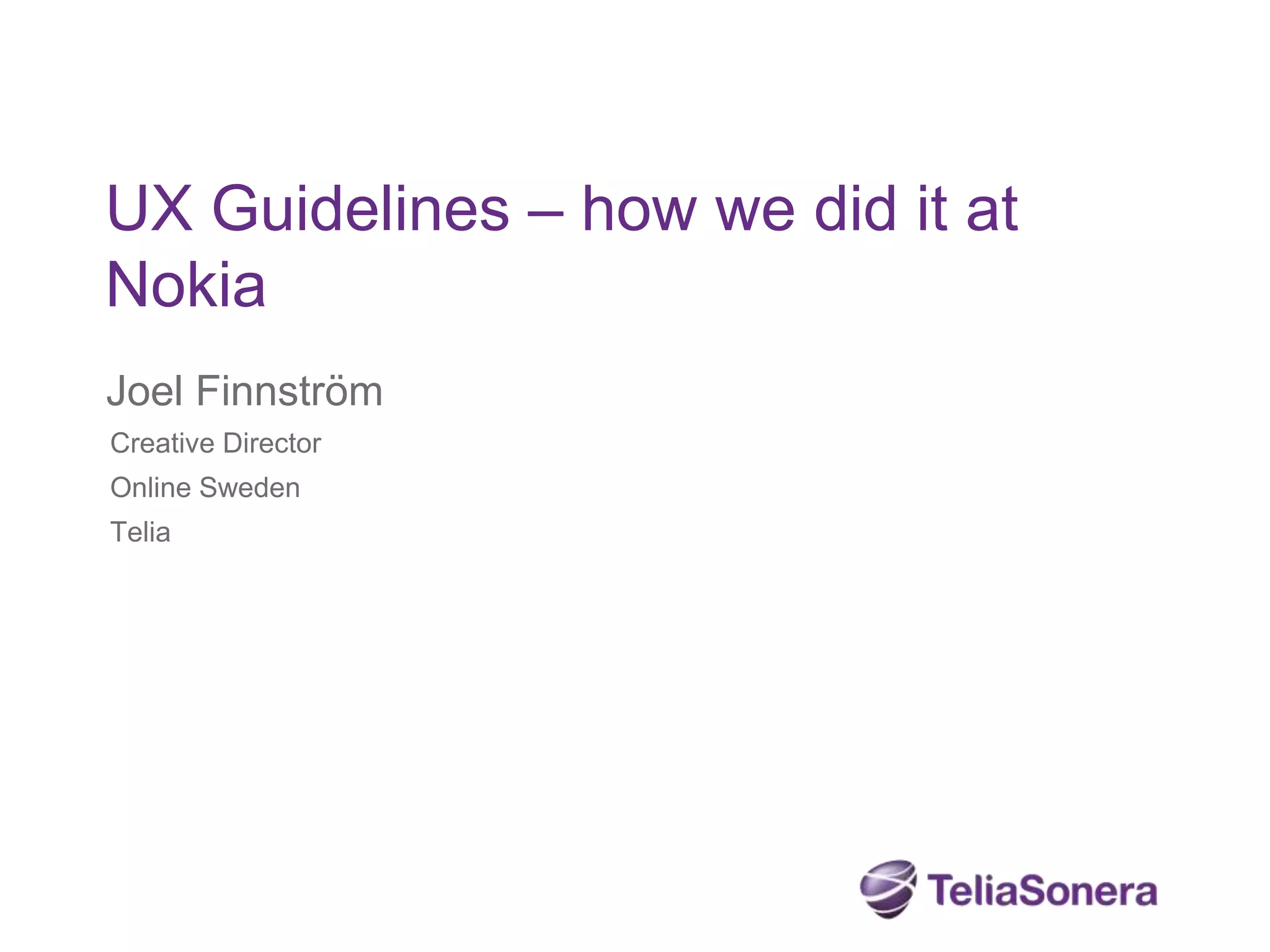 The document discusses Nokia's process for creating UX guidelines. They took an embedded, agile approach with cross-functional teams that were responsible for developing and testing components continuously. This allowed the guidelines to evolve based on feedback rather than being an afterthought. The guidelines focused on concrete examples like wireframes, designs, code, and prototypes to provide a shared understanding across roles like design, development, and testing. Write access and commenting was open to all teams.