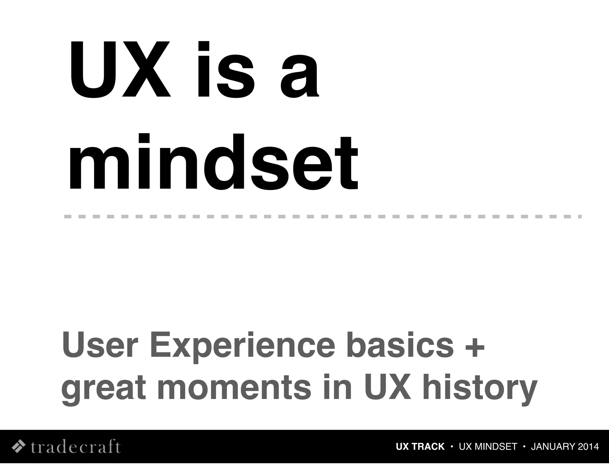 This document discusses user experience (UX) as a mindset focused on delivering value to users. It presents UX as considering who the users are, why the product matters to them, what they can do with it, and how the features fit together. The document contrasts UX with user interface (UI) design. It then provides examples of how to apply the UX mindset when designing a product by asking questions about the users and their needs, uses, and features. The document also presents UX as involving various roles like user research, strategy, and design. It provides a brief history of the evolution of UX from its roots in fields like human factors and usability to today's focus on the overall user experience