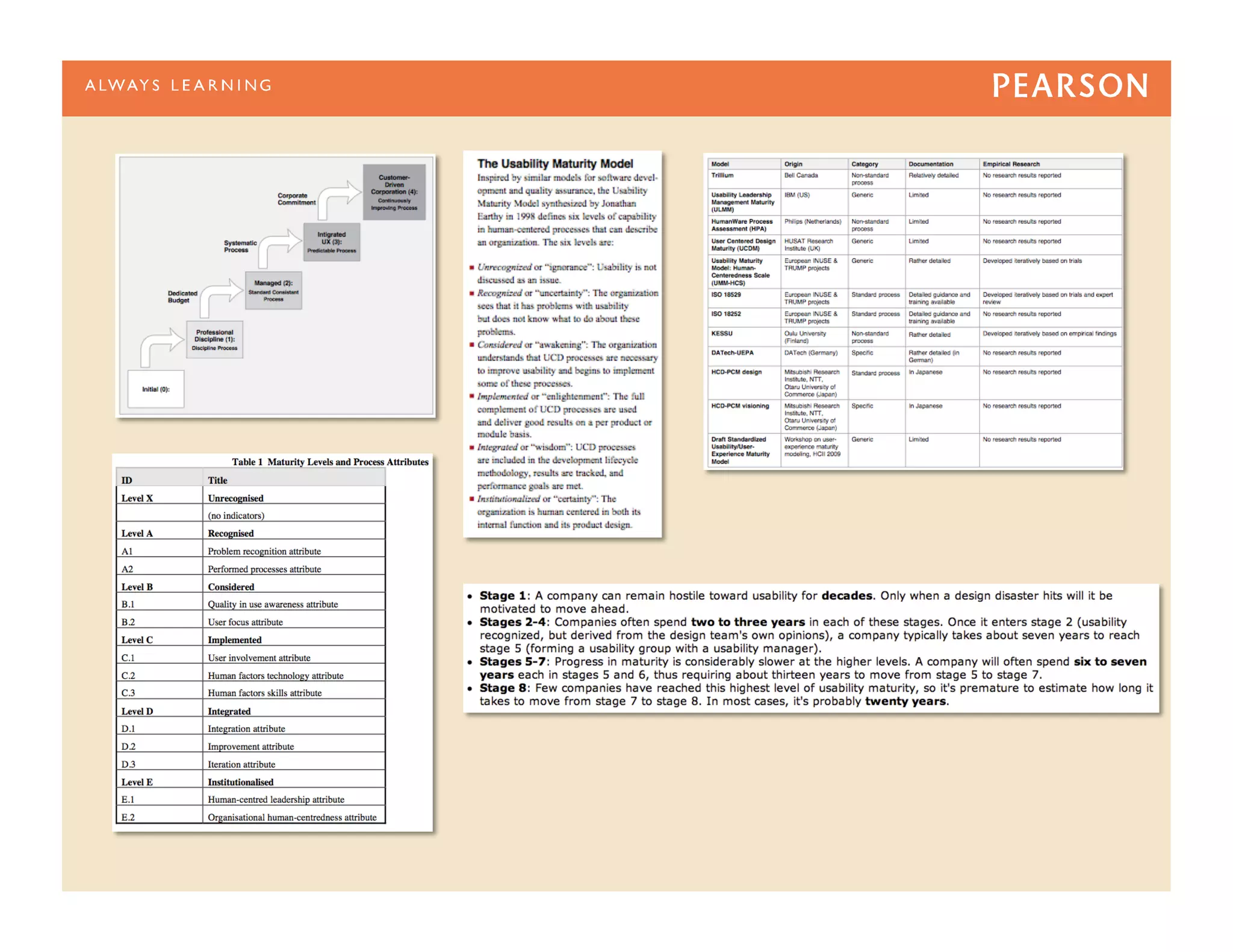 The document discusses UX maturity models, outlining stages of UX development within organizations, from initial unawareness to institutionalized practices where UX is a core business strategy. It highlights the progression through various levels, emphasizing the importance of dedicated resources, consistent practices, and evolving methodologies that align with user-centered design. The models serve as a framework for companies to assess and improve their UX processes over time.