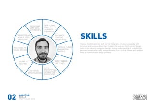 The document outlines a UX portfolio highlighting the author's multidisciplinary skills in design, user research, and project management, showcasing over 50 digital projects for leading companies. It details the design process, including user data gathering, persona creation, wireframing, and usability testing for specific projects such as imggolf.com and sport24-tv.com, emphasizing the importance of understanding user needs and behaviors. Additionally, it presents case studies that illustrate the author's approach to creating effective user experiences and achieving project goals.