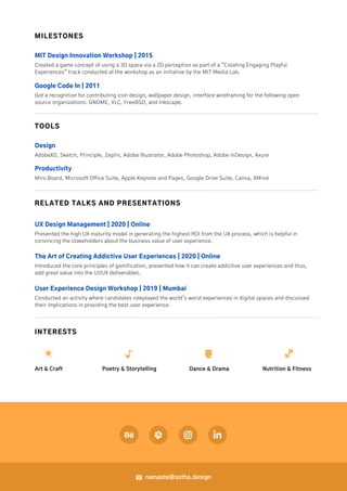 This document contains the resume of Astha Sethi, a UX designer with over 7 years of experience. She has worked at companies like EvolutionCo, Nykaa, and Newfold Digital in UX roles. She also has experience mentoring students in UI/UX through programs at Freelancers Academy, ImagineXP, and Designerrs Lab. Her education includes a B.Design degree from Symbiosis Institute of Design specializing in User Experience.