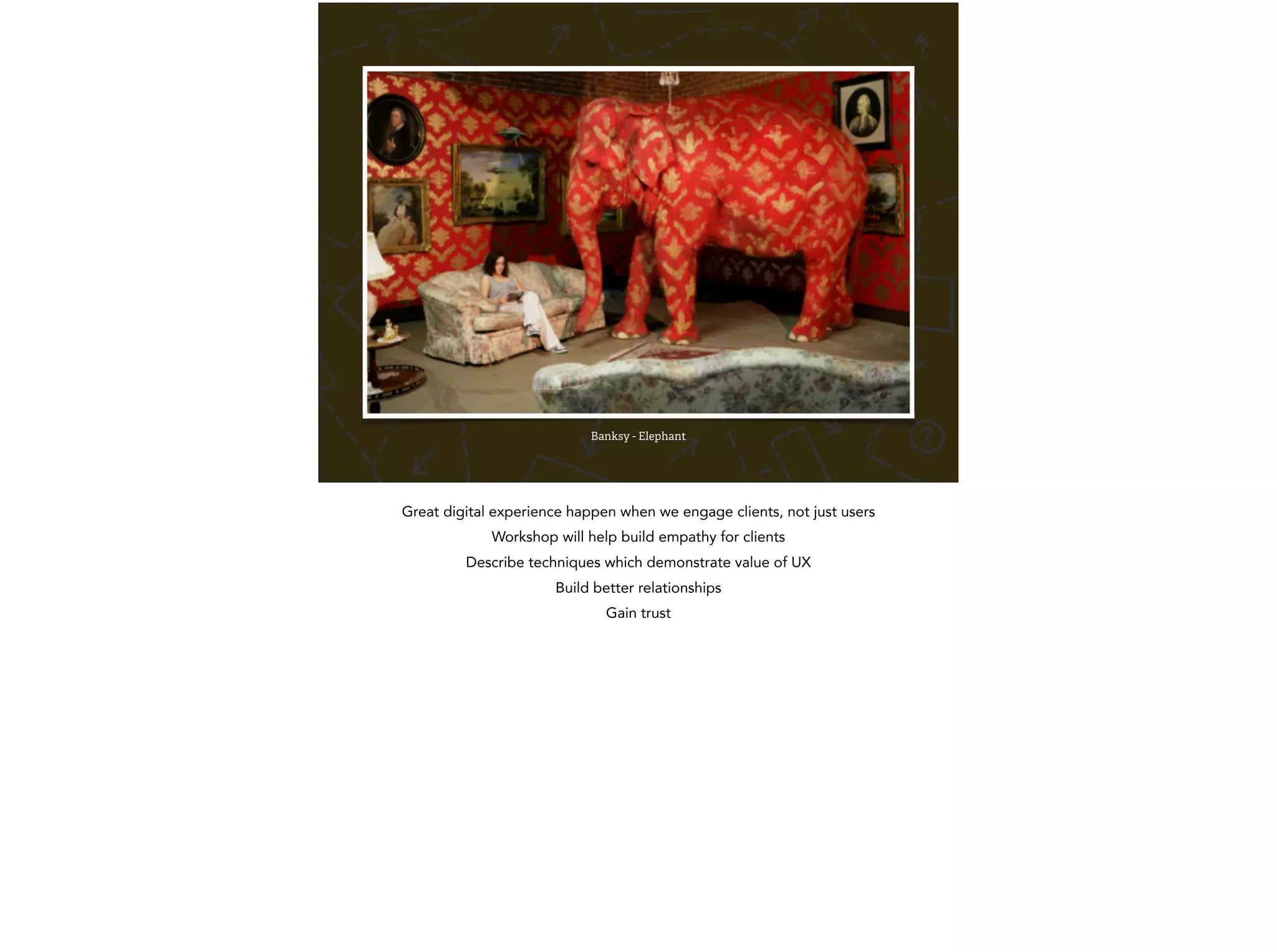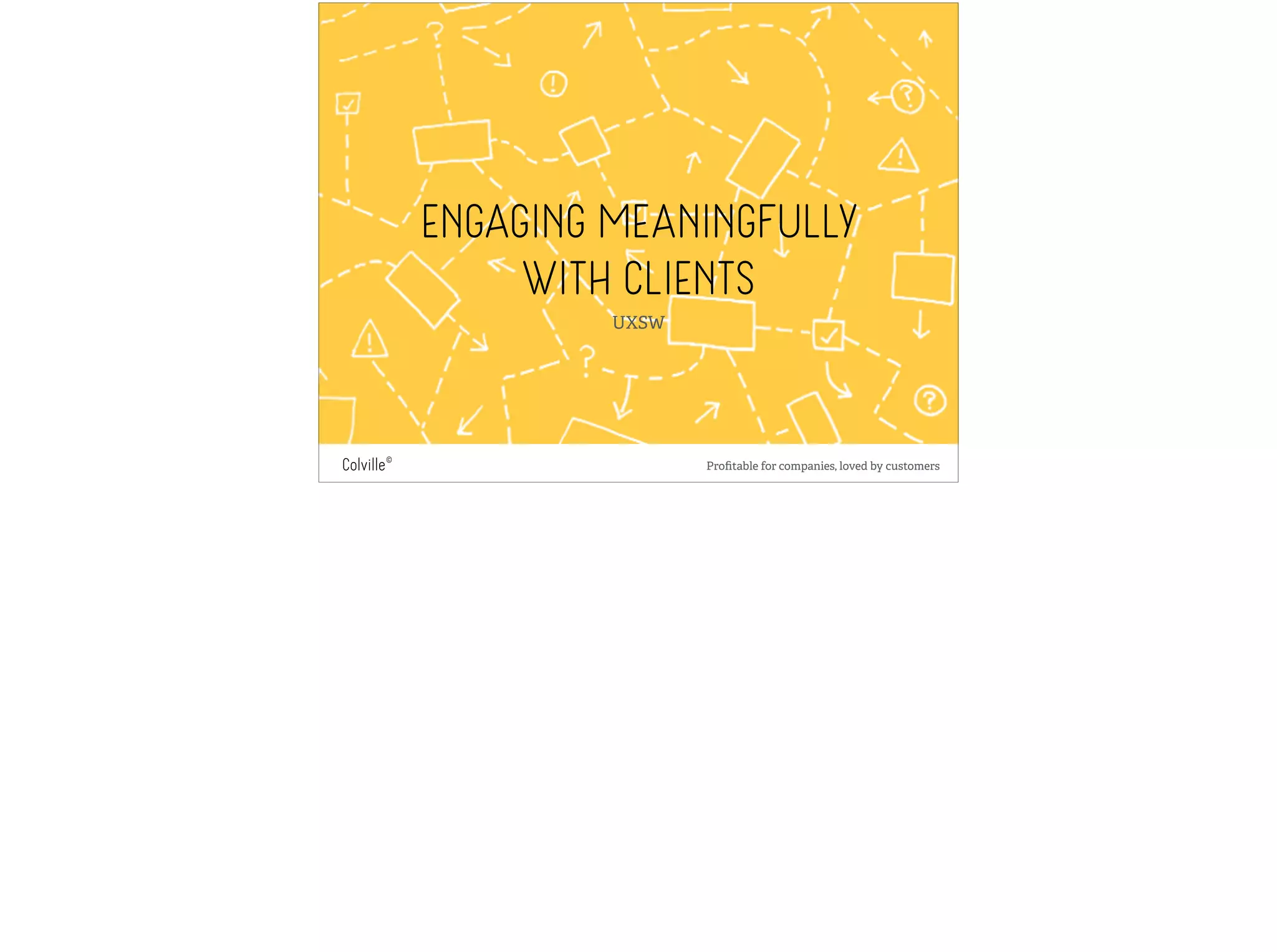 The document discusses the importance of engaging clients meaningfully during the design process to improve customer experience and relationships. It emphasizes the need for empathy, clear communication, and collaborative techniques such as sketching and storytelling to better understand client needs and foster shared ownership. Ultimately, the goal is to enhance user experience by shifting the focus from mere aesthetics to a deeper comprehension of user engagement with the client's brand.