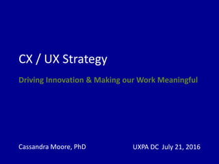 Cassandra Moore discusses how to develop an experience strategy by aligning user experience activities with organizational goals. She emphasizes understanding the organization's goals, challenges, and value proposition. An experience strategy should include a plan of activities with timelines that address goals by providing data and solving problems. Activities should be selected based on how they contribute to achieving goals and improving the customer experience. The strategy should be communicated simply to stakeholders using visual tools that connect emotionally and tell a story.