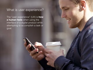This document discusses user experience (UX) strategy. It defines UX as how a human feels when using a digital product to accomplish a goal. UX strategy focuses on the big picture of interconnecting all products within a brand's ecosystem to provide a unified experience. The document outlines that UX strategy is needed to validate assumptions about a solution's value proposition with customers before development. It presents the four tenets of UX strategy as cost leadership, differentiation, UX differentiation, and business strategy that requires research, analysis, testing, and iteration.