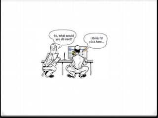 This document discusses various methods for conducting user experience testing in libraries to improve services, including A/B testing, card sorting, and talk-aloud protocols. It provides descriptions and supplies needed for each method. A/B testing involves testing two different designs to see which performs better, card sorting involves having users organize cards to show relationships between concepts, and talk-aloud protocols have users verbally explain their thoughts while completing tasks. The goal is to learn how patrons think and experience the library in order to make services more intuitive and user-friendly.