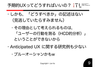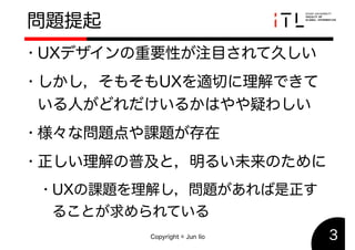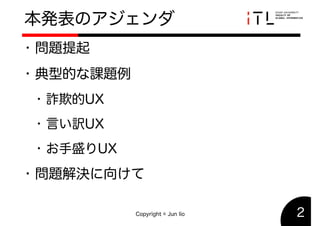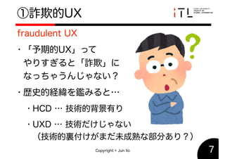 2019年度春季HCD研究発表会で発表した「UXDの課題」のスライドです. This slide is used in the 2019 HCD conference held at Shibaura Institute of Technology. This reports three problems in UXD: Fraudulent UX, Excuse UX, and Self-serving UX.