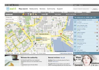 This document discusses user experience design for mobile resources and creation. It provides a three step process for user experience driven service development: [1] Service concepting to understand user needs and create personas, [2] Application planning to design interface details, and [3] Evaluation to ensure it meets user needs. The document emphasizes starting by answering "what's in it for me?" from the user perspective and provides examples from the eat.fi restaurant finder case study.