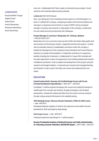 The document outlines the professional experience and skills of Natalia Skrepinskaya, a UX/UI designer and researcher with expertise in user experience design, usability testing, and web development. She has worked with various teams on projects involving responsive interfaces, user-centered design, and data analysis, while also collaborating remotely across different locations. Her educational background includes design certifications and a bachelor's degree, and she is multilingual with fluency in several languages.
