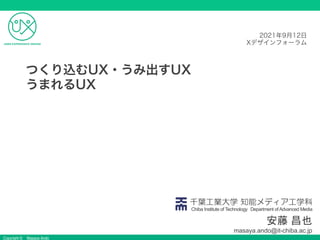 Ando 安藤 昌也 masaya.ando@it-chiba.ac.jp 千葉工業大学 知能メディア工学科 Chiba Institute of Technology Department ofAdvanced Media つくり込むUX・うみ出すUX うまれるUX 2021年9月12日 Xデザインフォーラム