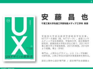Ando 1 安 藤 昌 也 千葉工業大学先進工学部知能メディア工学科 教授 早 稲 田 大 学 政 治 経 済 学 部 経 済 学 科 卒 業 。 NTTデータ通信(現、NTTデータ)、経営コンサ ルティング会社取締役、早稲田大学、国立情報学 研究所、産業技術大学院大学など経て、2011年千 葉工業大学工学部准教授、2015年教授。2016年 より現職。博士(学術) . 専門は、人間中心デザイン。UX(ユーザ体験) の研究者。人間工学ISOの国内対策委員等を務める。 認定人間中心設計専門家 / 認定専門社会調査士