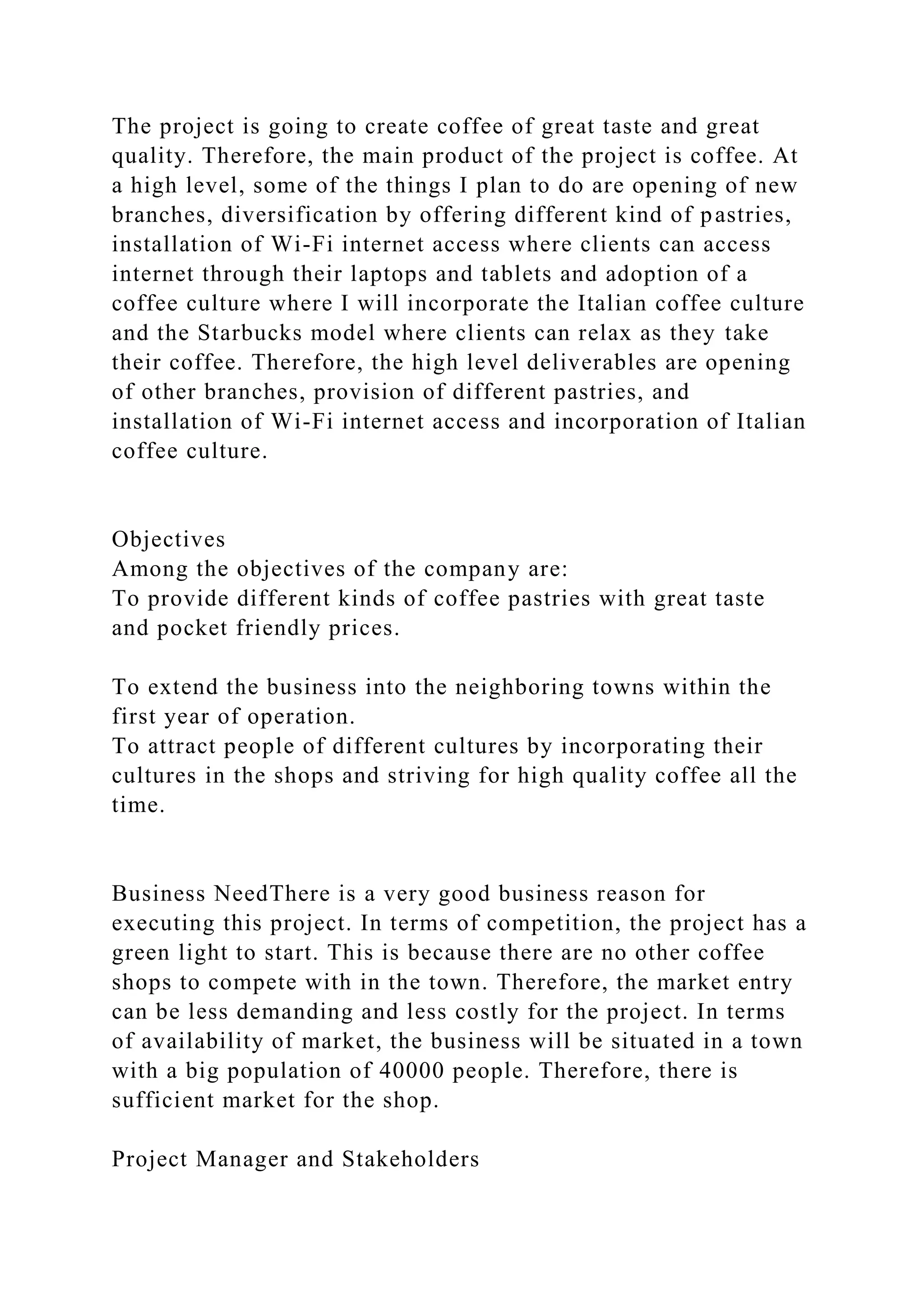 The document outlines a project to establish a coffee shop in a small town with a population of 40,000, aiming to provide high-quality coffee and a comfortable ambiance to capture a significant market share. Key objectives include offering diverse pastries, expanding to neighboring towns, and integrating different cultural elements into the business model while managing stakeholder roles and potential financial risks. The project anticipates minimal competition and plans for essential budget allocations to meet high-quality standards in both product and customer service.