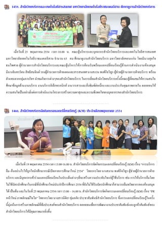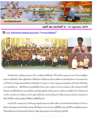 16 - 31 พฤษภาคม 2554 1458. สานักวิทยบริการจัดสัมมนาบุคลากรเรื่อง “การบริการที่เป็นเลิศ” สานักวิทยบริการ จัดสัมมนาบุคลากร เรื่อง “การจัดบริการที่เป็นเลิศ” ขึ้นในวันที่ 22 พฤษภาคม 2554 วิทยากรโดยผู้ช่วย ศาสตราจารย์ชัยวัฒน์ วงศ์อาษา ผู้ช่วยอธิการบดีฝ่ายกิจการนักศึกษาและกิจกรรมพิเศษ มหาวิทยาลัยมหิดล ณ โรงแรมเดอะกรีน เนอรี่ รีสอร์ท เขาใหญ่ ตลอดจนจัดกิจกรรมสัมพันธ์ระหว่างบุคลากร “กิจกรรมชุมนุมระดมพล(Rally) สร้างบริการเป็นเลิศกับ การรวมพลังทีมงาน” เพื่อให้เกิดความสามัคคียิ่งขึ้น วิทยากรโดย นายจิตต นิวาสะวัต และทีมงาน ซึ่งการสัมมนาในครั้งนี้ มีวัตถุประสงค์เพื่อให้บุคลากรตระหนักถึงความสาคัญของผู้ บริการที่สนองตอบความต้องการของผู้รับบริการ ให้บุคลากรมี แนวคิด และหลัก การการพั ฒนาการบริก ารสู่ค วามเป็ นเลิศ ตลอดจนให้บุ คลากรได้ทบทวนผลการดาเนินงานของตนเอง เพื่อนาไปใช้ในการปรับปรุงพัฒนาให้ได้ผลงานที่ดียิ่งขึ้นต่อไป และในวันที่ 23 พฤษภาคม 2554 ศึกษาดูงานศูนย์บรรณสารและสื่อการศึกษา มหาวิทยาลัยเทคโนโลยีสุรนารี เรื่องการ จัดบริการห้องสมุดและเทคโนโลยีสารสนเทศ เพื่อให้บุคลากรสามารถนาความรู้ที่ได้รับมาประยุกต์ใช้ในการปฏิบัติงานของตน ให้สอดคล้องกับภารกิจหลักของสานักวิทยบริการพัฒนาศักยภาพบุคลากรในองค์กรสู่ความเป็นเลิศ