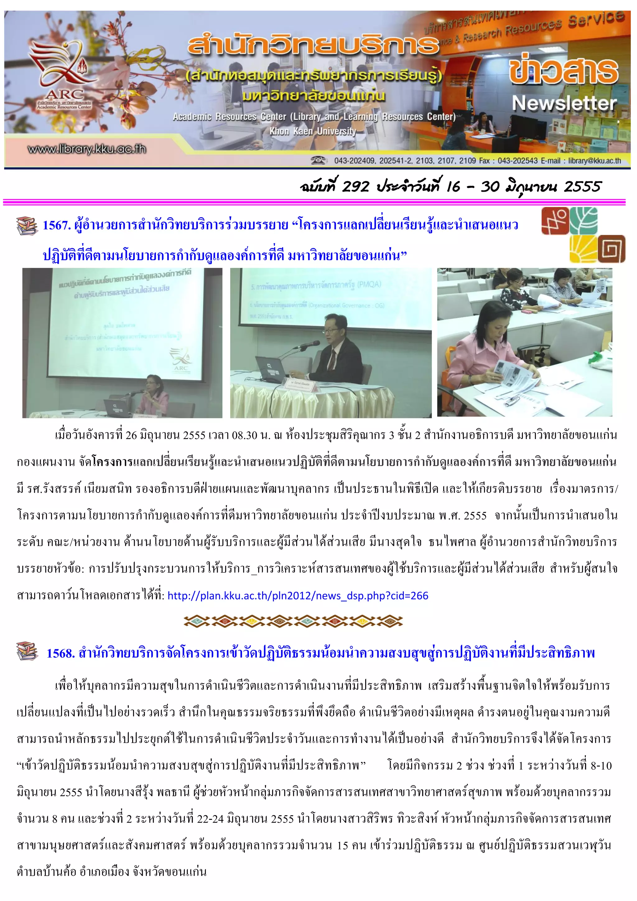 16 - 30 มิถนำยน 2555 ุ 1567. ผู้อำนวยกำรสำนักวิทยบริกำรร่วมบรรยำย “โครงกำรแลกเปลี่ยนเรียนรู้และนำเสนอแนว ปฏิบัติที่ดีตำมนโยบำยกำรกำกับดูแลองค์กำรที่ดี มหำวิทยำลัยขอนแก่น” เมื่อวันอังคารที่ 26 มิถุนายน 2555 เวลา 08.30 น. ณ ห้องประชุมสิริคุณากร 3 ชั้น 2 สานักงานอธิการบดี มหาวิทยาลัยขอนแก่น กองแผนงาน จัดโครงกำรแลกเปลี่ยนเรียนรู้และนำเสนอแนวปฏิบัติที่ดีตำมนโยบำยกำรกำกับดูแลองค์กำรที่ดี มหำวิทยำลัยขอนแก่น มี รศ.รังสรรค์ เนียมสนิท รองอธิการบดีฝ่ายแผนและพัฒนาบุคลากร เป็นประธานในพิธีเปิด และให้เกียรติบรรยาย เรื่องมาตรการ/ โครงการตามนโยบายการกากับดูแลองค์การที่ดีมหาวิทยาลัยขอนแก่น ประจาปีงบประมาณ พ.ศ. 2555 จากนั้นเป็นการนาเสนอใน ระดับ คณะ/หน่วยงาน ด้านนโยบายด้านผู้รับบริการและผู้มีส่วนได้ส่วนเสีย มีนางสุดใจ ธนไพศาล ผู้อานวยการสานักวิทยบริการ บรรยายหัวข้อ: การปรับปรุงกระบวนการให้บริการ_การวิเคราะห์สารสนเทศของผู้ใช้บริการและผู้มีส่วนได้ส่วนเสีย สาหรับผู้สนใจ สามารถดาว์นโหลดเอกสารได้ที่: http://plan.kku.ac.th/pln2012/news_dsp.php?cid=266 1568. สำนักวิทยบริกำรจัดโครงกำรเข้ำวัดปฏิบัติธรรมน้อมนำควำมสงบสุขสู่กำรปฏิบัติงำนที่มีประสิทธิภำพ เพื่อให้บุคลากรมีความสุขในการดาเนินชีวิตและการดาเนินงานที่มีประสิทธิภาพ เสริมสร้างพื้นฐานจิตใจให้พร้อมรับการ เปลี่ยนแปลงที่เป็นไปอย่างรวดเร็ว สานึกในคุณธรรมจริยธรรมที่พึงยึดถือ ดาเนินชีวิตอย่างมีเหตุผล ดารงตนอยู่ในคุณงามความดี สามารถนาหลักธรรมไปประยุกต์ใช้ในการดาเนิ นชีวิตประจาวันและการทางานได้เป็นอย่างดี สานักวิทยบริการจึงได้จัดโครงการ “เข้าวัดปฏิบัติธรรมน้อมนาความสงบสุขสู่การปฏิบัติงานที่มีประสิทธิภาพ” โดยมีกิจกรรม 2 ช่วง ช่วงที่ 1 ระหว่างวันที่ 8-10 มิถุนายน 2555 นาโดยนางสีรุ้ง พลธานี ผู้ช่วยหัวหน้ากลุ่มภารกิจจัดการสารสนเทศสาขาวิทยาศาสตร์สุขภาพ พร้อมด้วยบุคลากรรวม จานวน 8 คน และช่วงที่ 2 ระหว่างวันที่ 22-24 มิถุนายน 2555 นาโดยนางสาวสิริพร ทิวะสิงห์ หัวหน้ากลุ่มภารกิจจัดการสารสนเทศ สาขามนุษยศาสตร์และสังคมศาสตร์ พร้อมด้วยบุคลากรรวมจานวน 15 คน เข้าร่วมปฏิบัติธรรม ณ ศูนย์ปฏิบัติธรรมสวนเวฬุวัน ตาบลบ้านค้อ อาเภอเมือง จังหวัดขอนแก่น