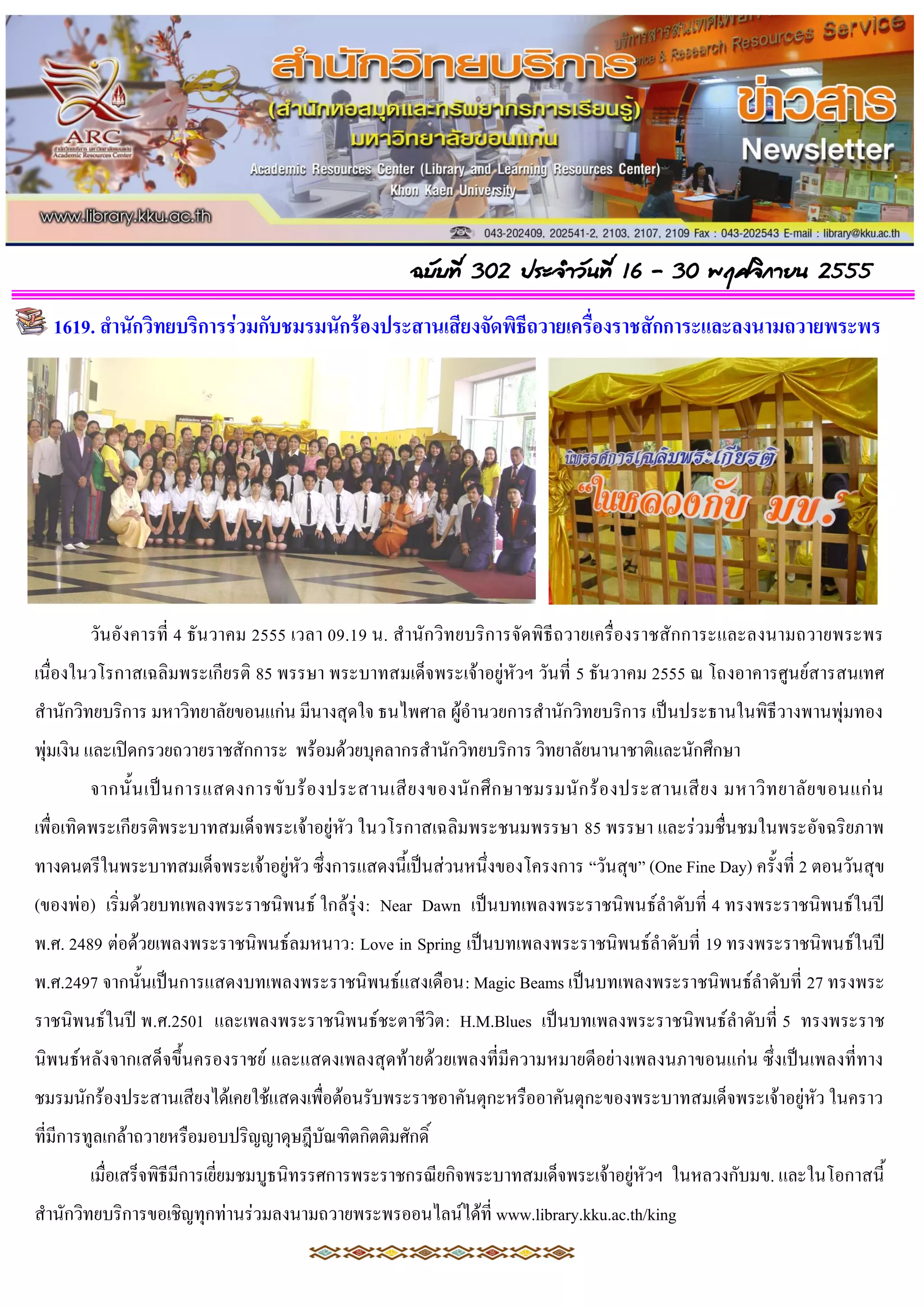 16 - 30 พฤศจิกำยน 2555 1619. สำนักวิทยบริกำรร่วมกับชมรมนักร้องประสำนเสียงจัดพิธีถวำยเครื่องรำชสักกำระและลงนำมถวำยพระพร วันอังคารที่ 4 ธันวาคม 2555 เวลา 09.19 น. สานักวิทยบริการจัดพิธีถวายเครื่องราชสักการะและลงนามถวายพระพร เนื่องในวโรกาสเฉลิมพระเกียรติ 85 พรรษา พระบาทสมเด็จพระเจ้าอยู่หัวฯ วันที่ 5 ธันวาคม 2555 ณ โถงอาคารศูนย์สารสนเทศ สานักวิทยบริการ มหาวิทยาลัยขอนแก่น มีนางสุดใจ ธนไพศาล ผู้อานวยการสานักวิทยบริการ เป็นประธานในพิธีวางพานพุ่มทอง พุ่มเงิน และเปิดกรวยถวายราชสักการะ พร้อมด้วยบุคลากรสานักวิทยบริการ วิทยาลัยนานาชาติและนักศึกษา จากนั้ น เป็ น การแสดงการขั บ ร้ อ งประสานเสี ย งของนั ก ศึ ก ษาชมรมนั ก ร้ อ งประสานเสี ย ง มหาวิ ท ยาลั ย ขอนแก่ น เพื่อเทิดพระเกียรติพระบาทสมเด็จพระเจ้าอยู่หัว ในวโรกาสเฉลิมพระชนมพรรษา 85 พรรษา และร่วมชื่นชมในพระอัจฉริยภาพ ทางดนตรีในพระบาทสมเด็จพระเจ้าอยู่หัว ซึ่งการแสดงนี้เป็นส่วนหนึ่งของโครงการ “วันสุข” (One Fine Day) ครั้งที่ 2 ตอนวันสุข (ของพ่อ) เริ่มด้วยบทเพลงพระราชนิพนธ์ ใกล้รุ่ง : Near Dawn เป็นบทเพลงพระราชนิพนธ์ลาดับที่ 4 ทรงพระราชนิพนธ์ในปี พ.ศ. 2489 ต่อด้วยเพลงพระราชนิพนธ์ลมหนาว: Love in Spring เป็นบทเพลงพระราชนิพนธ์ลาดับที่ 19 ทรงพระราชนิพนธ์ในปี พ.ศ.2497 จากนั้นเป็นการแสดงบทเพลงพระราชนิพนธ์แสงเดือน: Magic Beams เป็นบทเพลงพระราชนิพนธ์ลาดับที่ 27 ทรงพระ ราชนิพนธ์ในปี พ.ศ.2501 และเพลงพระราชนิพนธ์ชะตาชีวิต : H.M.Blues เป็นบทเพลงพระราชนิพนธ์ลาดับที่ 5 ทรงพระราช นิพนธ์หลังจากเสด็จขึ้นครองราชย์ และแสดงเพลงสุดท้ายด้วยเพลงที่มีความหมายดีอย่างเพลงนภาขอนแก่น ซึ่งเป็นเพลงที่ทาง ชมรมนักร้องประสานเสียงได้เคยใช้แสดงเพื่อต้อนรับพระราชอาคันตุกะหรืออาคันตุกะของพระบาทสมเด็จพระเจ้าอยู่หัว ในคราว ที่มีการทูลเกล้าถวายหรือมอบปริญญาดุษฎีบัณฑิตกิตติมศักดิ์ เมื่อเสร็จพิธีมีการเยี่ยมชมบูธนิทรรศการพระราชกรณียกิจพระบาทสมเด็จพระเจ้าอยู่หัวฯ ในหลวงกับมข. และในโอกาสนี้ สานักวิทยบริการขอเชิญทุกท่านร่วมลงนามถวายพระพรออนไลน์ได้ที่ www.library.kku.ac.th/king