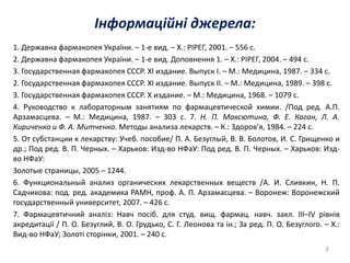 1. Державнафармакопея України. – 1-е вид. – Х.: РІРЕГ, 2001. – 556 с.