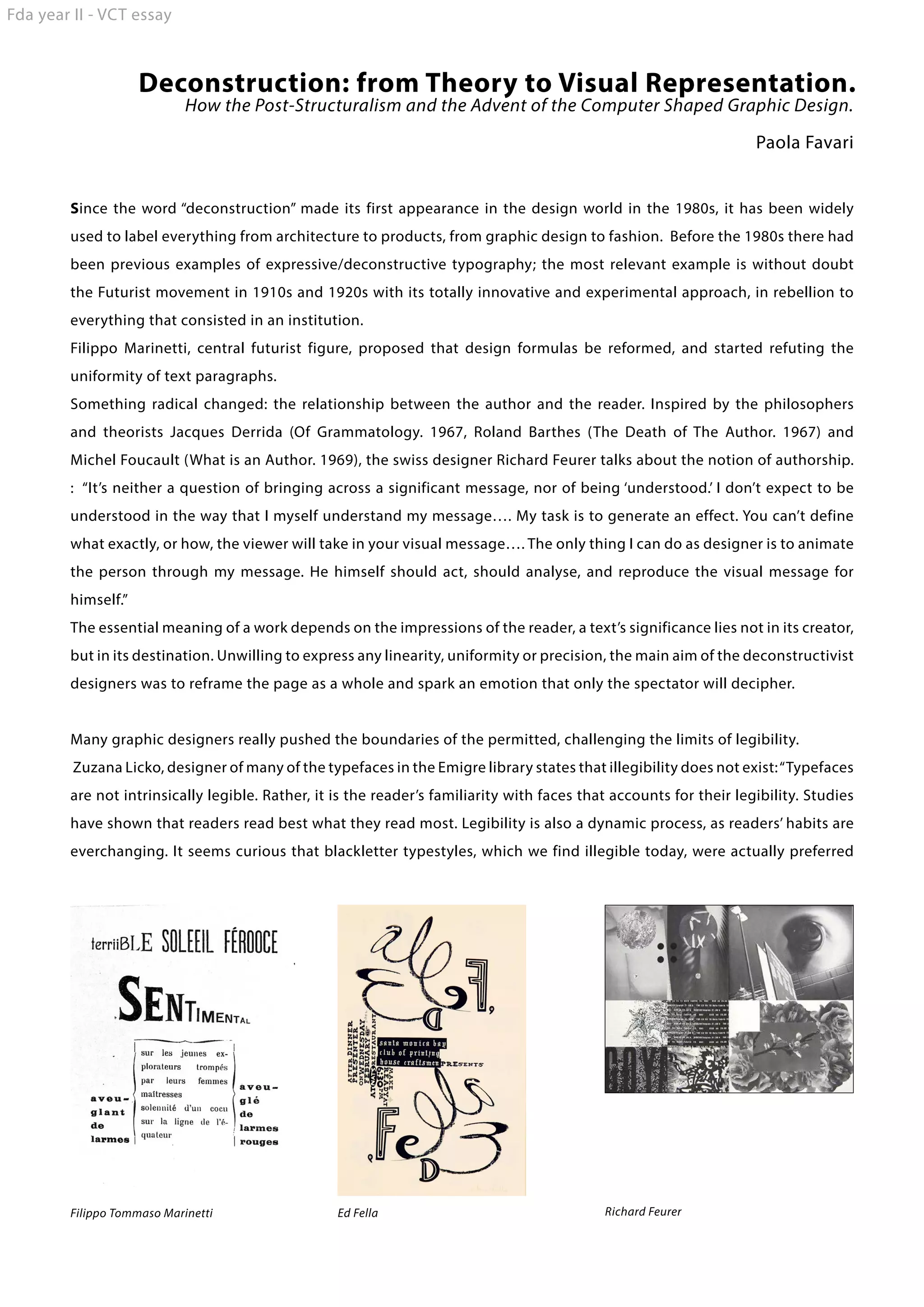 The document discusses the evolution of deconstructivism in graphic design, tracing its roots from the futurist movement to contemporary practices influenced by post-structuralist theories. It highlights the impact of digital technology and critical theory on design, particularly how it has reshaped typography, layout, and the relationship between the author and viewer. Key figures like David Carson exemplify this shift, challenging traditional concepts of legibility and embracing a visually dynamic approach to communication.