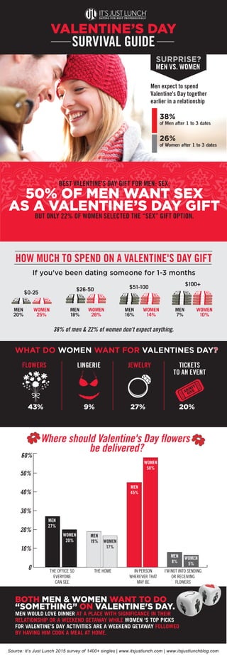 The document discusses the preferences of men and women for Valentine's Day gifts and activities, revealing that women prefer flowers, jewelry, and experiences, while men desire intimacy. A survey indicates that many people, especially in the early stages of dating, do not expect extravagant gifts. Overall, both genders value meaningful experiences together, with a weekend getaway being a top choice.