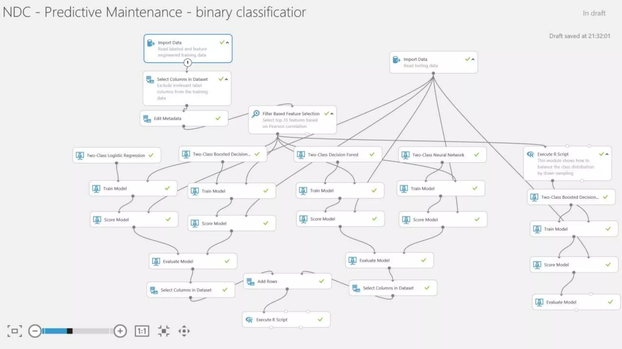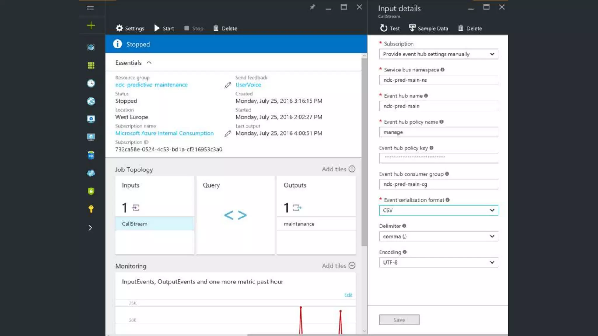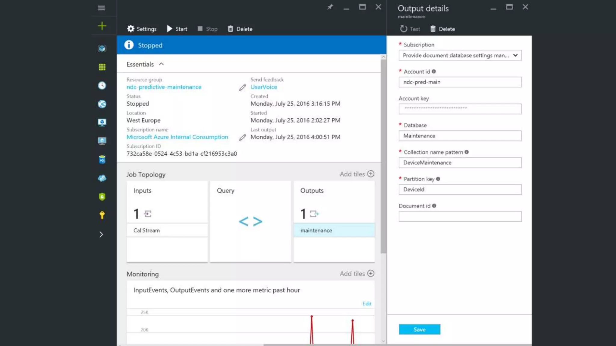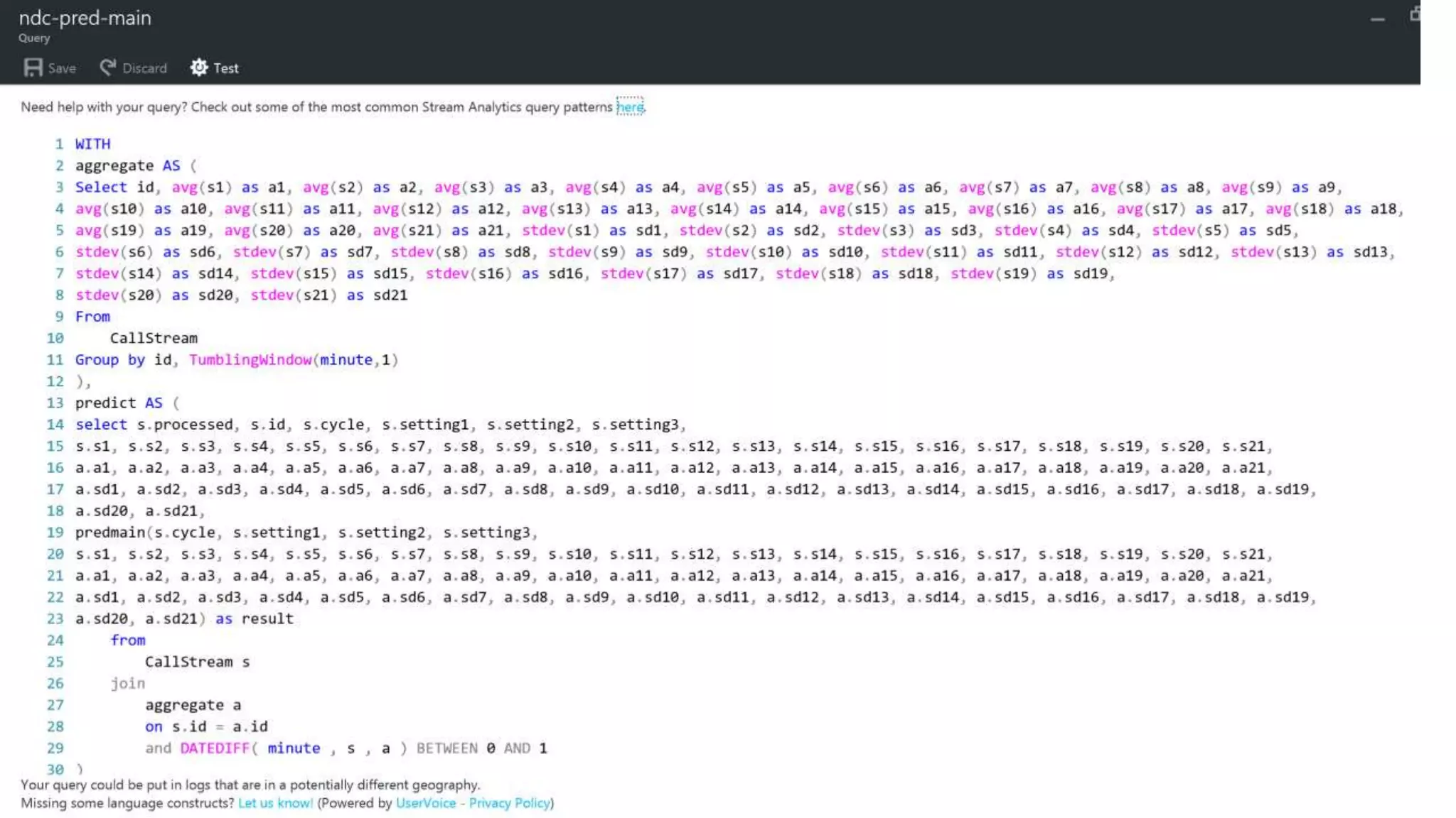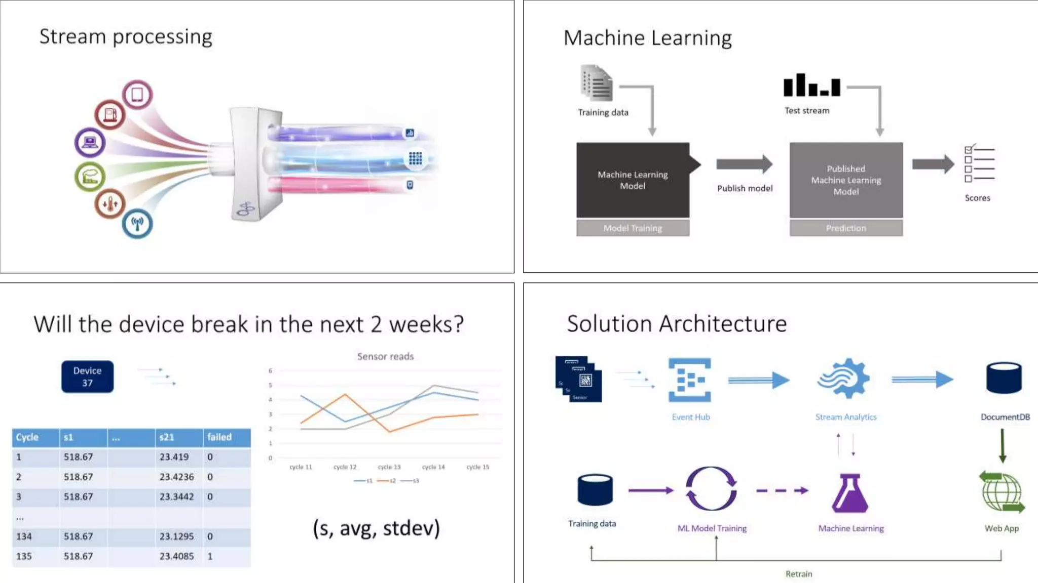 This document discusses using Azure Machine Learning and stream processing to enable predictive maintenance for aircraft engines. It describes a use case of predicting whether a device will fail within the next two weeks using real-time sensor data streams. It then outlines the challenges of stream processing and applying machine learning to streaming data. The proposed solution architecture involves using Event Hub for data ingestion, Stream Analytics for stream processing and aggregations, Machine Learning for model training and predictions, and DocumentDB for storing prediction results. It provides examples of the Stream Analytics and Machine Learning workflows used to enable predictive maintenance from real-time sensor data streams.