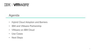 The presentation provided an overview of IBM and VMware's partnership to help enterprises adopt a hybrid cloud approach. It discussed common barriers to hybrid cloud, how the partnership addresses those barriers by providing VMware software and tools on IBM Cloud, and examples of use cases and benefits. Key points included maintaining the same VMware environment on both on-premises and IBM Cloud, no changes needed to tools or skills, and the ability to easily move workloads between locations.