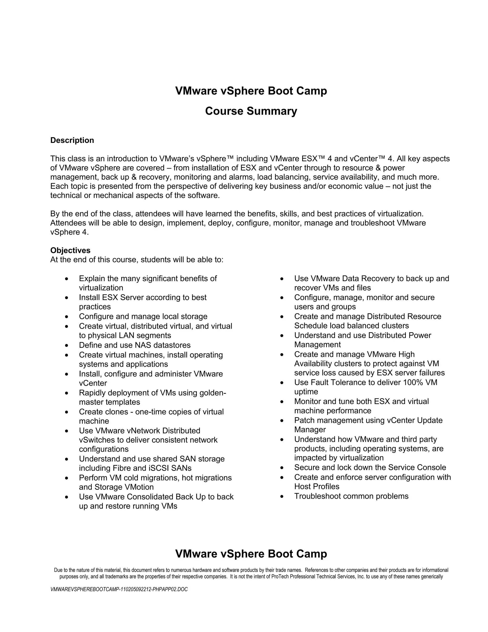 The document summarizes a 5-day VMware vSphere Boot Camp that covers all key aspects of VMware vSphere including installation, configuration, management, monitoring and troubleshooting. By the end of the course, attendees will be able to design, implement, deploy, configure, monitor, manage and troubleshoot VMware vSphere 4. Topics include virtualization infrastructure, ESX installation, virtual networking, shared storage, virtual machines, vCenter, resource management, high availability, backup and recovery.