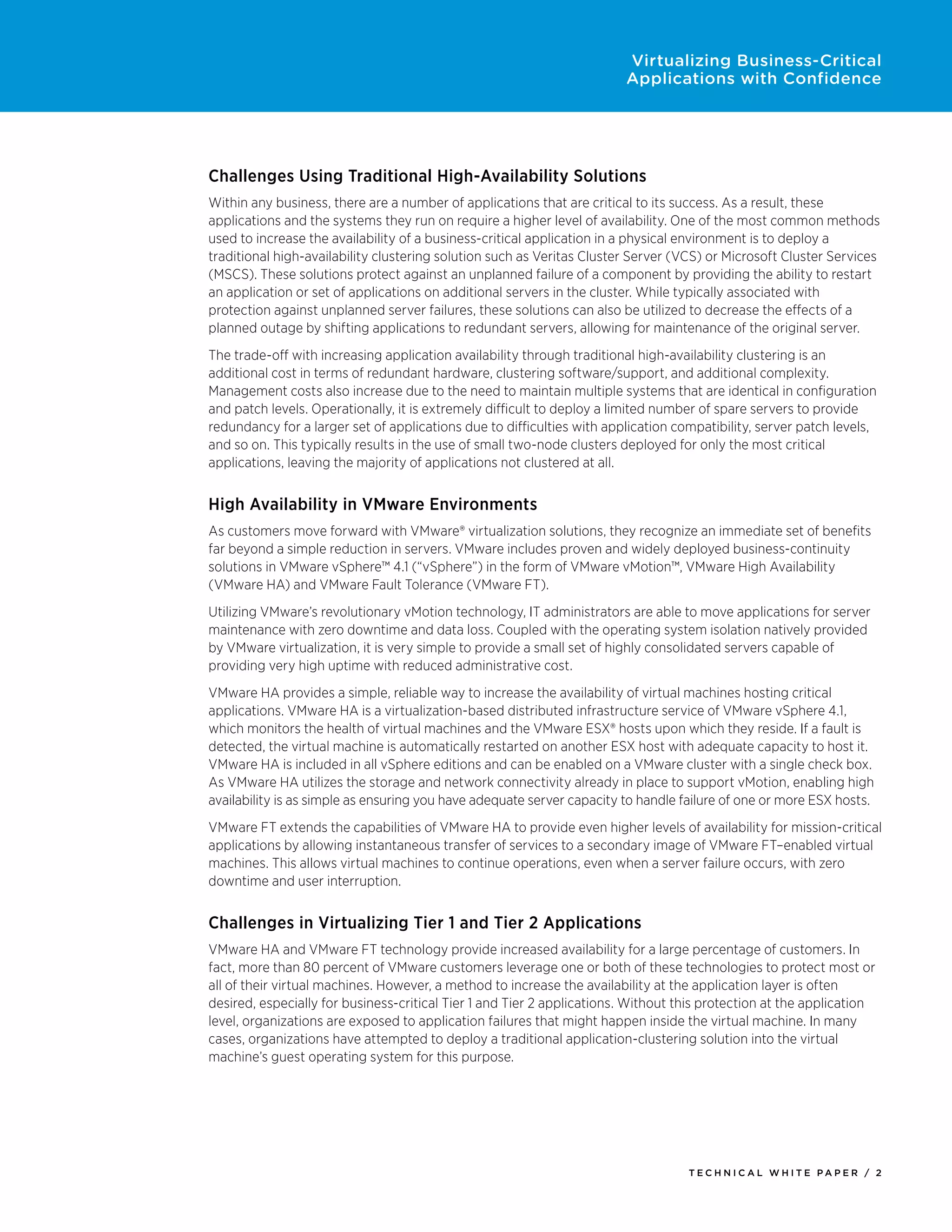 VMware HA and FT provide increased availability for virtual machines, but do not protect applications from failures within the virtual machine. Symantec ApplicationHA monitors applications within virtual machines and integrates with VMware HA to restart virtual machines if application failures occur. It enhances availability of tier 1 applications, improves manageability through a single interface, and reduces complexity versus traditional clustering solutions.