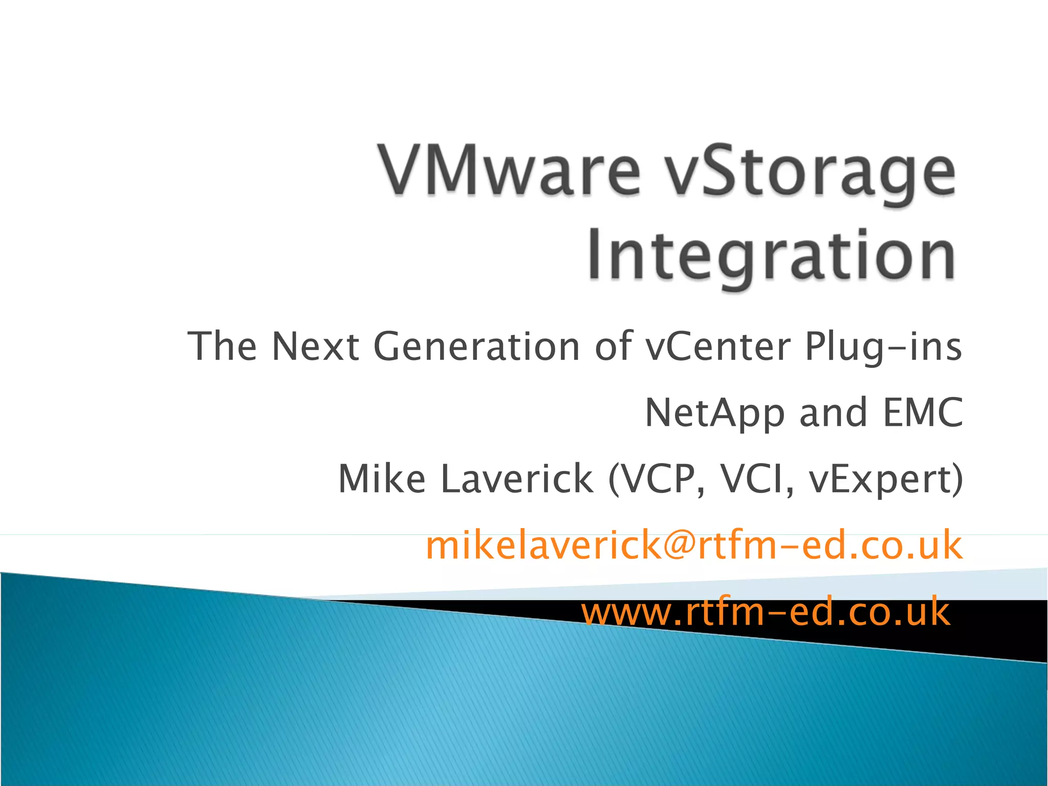 ![The Next Generation of vCenter Plug-ins NetApp and EMC Mike Laverick (VCP, VCI, vExpert) [email_address] www.rtfm-ed.co.uk](https://image.slidesharecdn.com/vmwarevstorageintregration-091023104807-phpapp01/75/V-Mwarev-Storage-Intregration-1-2048.jpg)