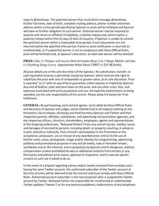 This document outlines the official rules of the VTech Baby Week Giveaway promotion on Twitter. The promotion period is one day, from April 10, 2013 8:00 AM to 8:00 PM CT. Eligible entrants are legal US and DC residents over 18 years old and must follow @vtechtoys on Twitter. Entrants can earn up to two entries by answering a trivia question with #VTechBabyWeek or retweeting a designated tweet. One random winner will be selected to receive a Garden Bugs 2-in-1 Magic Mobile and Soothing Songs Lovey toy set valued at $37.98.