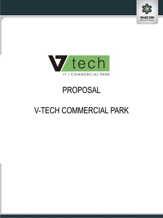 This proposal is for a commercial park project called V-Tech located in Nashik, India. The project will be built on 7 acres of land and have a total built up area of 500,000 square feet. Building C is currently under construction and will have 1 basement level and 5 floors above ground. It will have a bare shell structure with RCC framing, flat slabs, and a column grid of 10m x 8m. Amenities will include landscaped gardens, paved internal roads, granite tile lobby, and 100% diesel generator backup power. The developer is seeking tenants and can also provide spaces in other cities like Ahmedabad and Pune.
